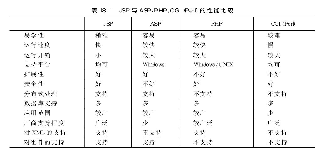 為簡明起見,下面將JSP與ASP.PHP、CGI(Perl)的性能作一歸納 比較,如表所示。