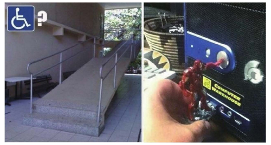 圖1-6是2幅網(wǎng)絡上流傳的照片,左圖的通道是為了殘障人士而設計的嗎? 看樣子好像是,又好像不是,讓人匪夷所思。右圖是鋼鐵俠造型的U盤,外觀很酷是不是? 但是使用的時候好像出了點問題。鋼鐵俠的手緊緊地按住了關機鍵,且手臂不能自由活動 。