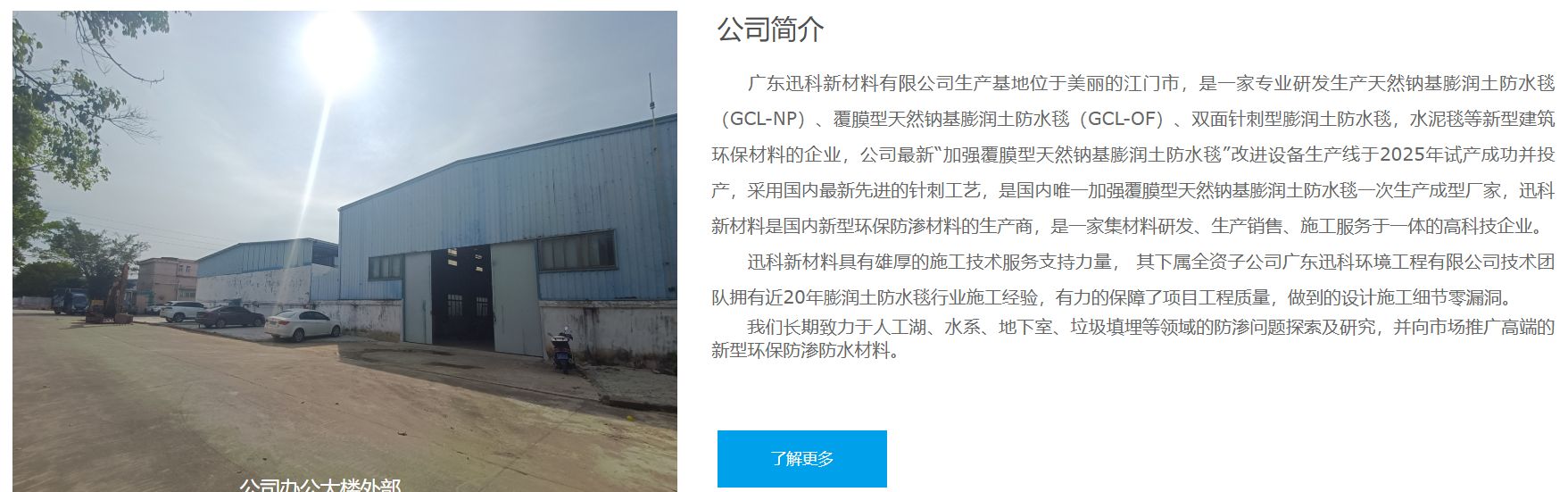 廣東迅科新材料有限公司生產(chǎn)基地位于美麗的江門市,是一家專業(yè)研發(fā)生產(chǎn)天然鈉基膨潤(rùn)土防水毯(GCL-NP)、覆膜型天然鈉基膨潤(rùn)土防水毯(GCL-OF)、雙面針刺型膨潤(rùn)土防水毯,水泥毯等新型建筑環(huán)保材料的企業(yè),公司最新“加強(qiáng)覆膜型天然鈉基膨潤(rùn)土防水毯”改進(jìn)設(shè)備生產(chǎn)線于2025年試產(chǎn)成功并投產(chǎn),采用國(guó)內(nèi)最新先進(jìn)的針刺工藝,是國(guó)內(nèi)唯一加強(qiáng)覆膜型天然鈉基膨潤(rùn)土防水毯一次生產(chǎn)成型廠家,迅科新材料是國(guó)內(nèi)新型環(huán)保防滲材料的生產(chǎn)商,是一家集材料研發(fā)、生產(chǎn)銷售、施工服務(wù)于一體的高科技企業(yè)。