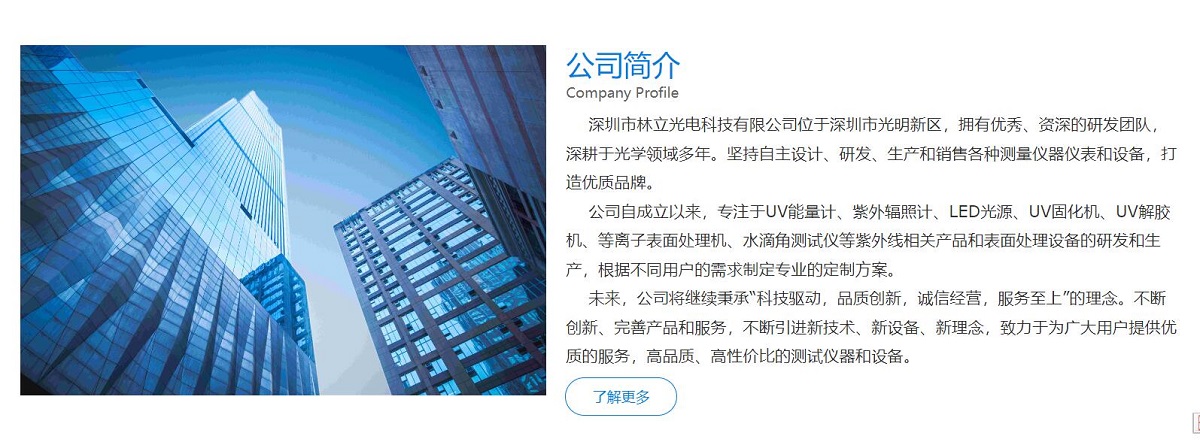 公司自成立以來(lái),專注于UV能量計(jì)、紫外輻照計(jì)、LED光源、UV固化機(jī)、UV解膠機(jī)、等離子表面處理機(jī)、水滴角測(cè)試儀等紫外線相關(guān)產(chǎn)品和表面處理設(shè)備的研發(fā)和生產(chǎn),根據(jù)不同用戶的需求制定專業(yè)的定制方案網(wǎng)站建設(shè)。