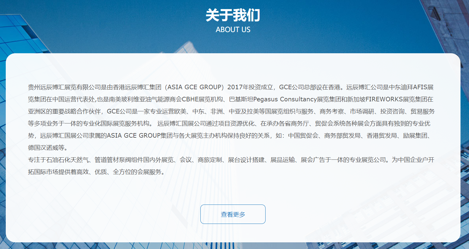 貴州遠(yuǎn)辰博匯展覽有限公司是由香港遠(yuǎn)辰博匯集團(tuán)(ASIA GCE GROUP)投資成立,GCE公司總部設(shè)在香港。遠(yuǎn)辰博匯公司是中東迪拜AFIS展覽集團(tuán)在中國運(yùn)營代表處,也是南美玻利維亞油氣能源商會CBHE展覽機(jī)構(gòu)、巴基斯坦Pegasus Consultancy展覽集團(tuán)和新加坡FIREWORKS展覽集團(tuán)在亞洲區(qū)的重要戰(zhàn)略合作伙伴,GCE公司是一家專業(yè)運(yùn)營歐美、中東、非洲、中亞及拉美等國展覽組織與服務(wù)、商務(wù)考察、市場調(diào)研、投資咨詢、貿(mào)易服務(wù)等多項業(yè)務(wù)于一體的專業(yè)化國際展覽服務(wù)機(jī)構(gòu)。