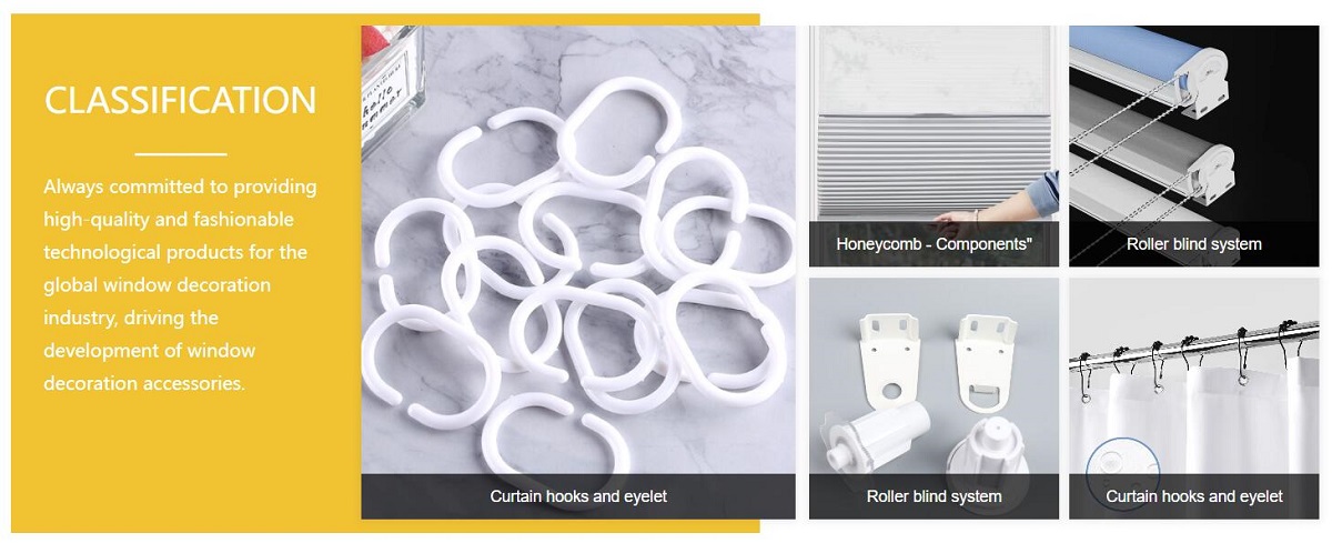 Our products mainly include the curtain hook, eyelet, buckles, roller, zebra, honeycomb, pleated, Roman blind components series.
