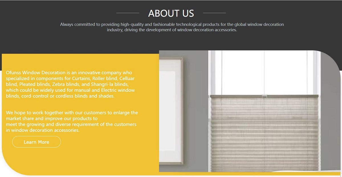 Ofunss Window Decoration was established in 2010, is one of most professional designer and manufacturer for high quality window Curtain & Blind accessories in China Zhengzhou city. Our company specialized in components for Curtains, Roller blind, Celluar blind, Pleated blinds, Zebra blinds, and Shangri-la blinds, which could be widely used for manual and Electric window blinds, cord-control or cordless blinds and shades.