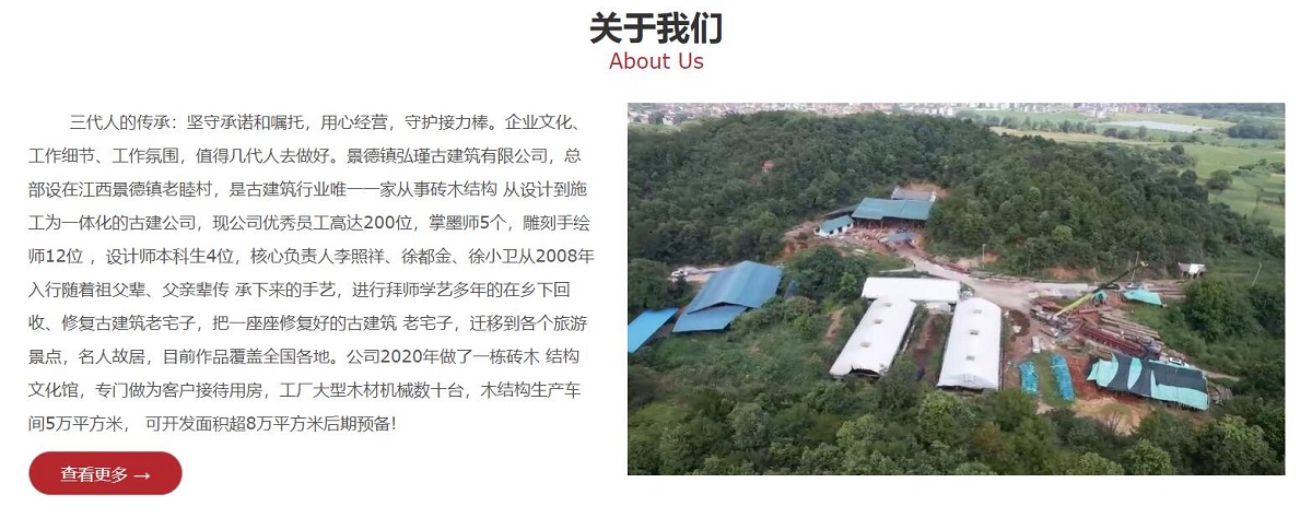 三代人的傳承:堅守承諾和囑托,用心經(jīng)營,守護接力棒。企業(yè)文化、工作細節(jié)、工作氛圍,值得幾代人去做好。景德鎮(zhèn)弘瑾古建筑有限公司,總部設(shè)在江西景德鎮(zhèn)老睦村,是古建筑行業(yè)唯一一家從事磚木結(jié)構(gòu) 從設(shè)計到施工為一體化的古建公司,現(xiàn)公司優(yōu)秀員工高達200位,掌墨師5個,雕刻手繪師12位 ,設(shè)計師本科生4位,核心負責(zé)人李照祥、徐都金、徐小衛(wèi)從2008年入行隨著祖父輩、父親輩傳 承下來的手藝,進行拜師學(xué)藝多年的在鄉(xiāng)下回收、修復(fù)古建筑老宅子,把一座座修復(fù)好的古建筑 老宅子,遷移到各個旅游景點,名人故居,目前作品覆蓋全國各地。公司2020年做了一棟磚木 結(jié)構(gòu)文化館,專門做為客戶接待用房,工廠大型木材機械數(shù)十臺,木結(jié)構(gòu)生產(chǎn)車間5萬平方米, 可開發(fā)面積超8萬平方米后期預(yù)備!