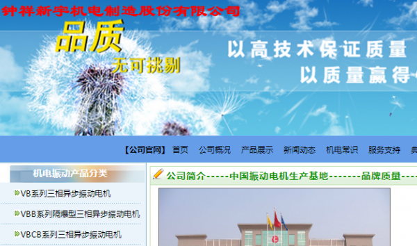 鐘祥新宇機(jī)電制造股份有限公司前身是鐘祥電機(jī)廠,創(chuàng)建于1968年,于2014年9月24日由“鐘祥新宇機(jī)電制造有限公司”變更名為“鐘祥新宇機(jī)電制造股份有限公司”。主要生產(chǎn)各類振動(dòng)電機(jī)、振動(dòng)機(jī)械、輸送機(jī)械。是中國(guó)電器工業(yè)協(xié)會(huì)中小型電機(jī)分會(huì)理事單位、中國(guó)重型機(jī)械工業(yè)協(xié)會(huì)洗選設(shè)備專業(yè)委員會(huì)理事單位,是中國(guó)具備真實(shí)生產(chǎn)實(shí)力的振動(dòng)電機(jī)生產(chǎn)廠家??蒲虚_(kāi)發(fā)力量雄厚,公司技術(shù)中心認(rèn)定為“湖北省企業(yè)技術(shù)中心”,現(xiàn)有教授級(jí)高級(jí)工程師2人,享受國(guó)家政府津貼專家2人,是國(guó)家部頒(行業(yè))標(biāo)準(zhǔn)《振動(dòng)源三相異步振動(dòng)電機(jī)技術(shù)條件》的主要制訂單位。企業(yè)內(nèi)部局域網(wǎng)、公司網(wǎng)站、CAD設(shè)計(jì)系統(tǒng)、互聯(lián)網(wǎng)已構(gòu)筑起企業(yè)計(jì)算機(jī)信息管理系統(tǒng);企業(yè)質(zhì)量管理體系獲得ISO9001:2000質(zhì)量管理體系認(rèn)證證書;產(chǎn)品獲CQC認(rèn)證和CCC認(rèn)證;享有“外貿(mào)進(jìn)出口自營(yíng)權(quán)”。是國(guó)內(nèi)很早生產(chǎn)振動(dòng)電機(jī)的廠家之一,生產(chǎn)的“宇興”牌振動(dòng)電機(jī)是國(guó)內(nèi)振動(dòng)電機(jī)行業(yè)和廣大客戶公認(rèn)的品牌產(chǎn)品。
